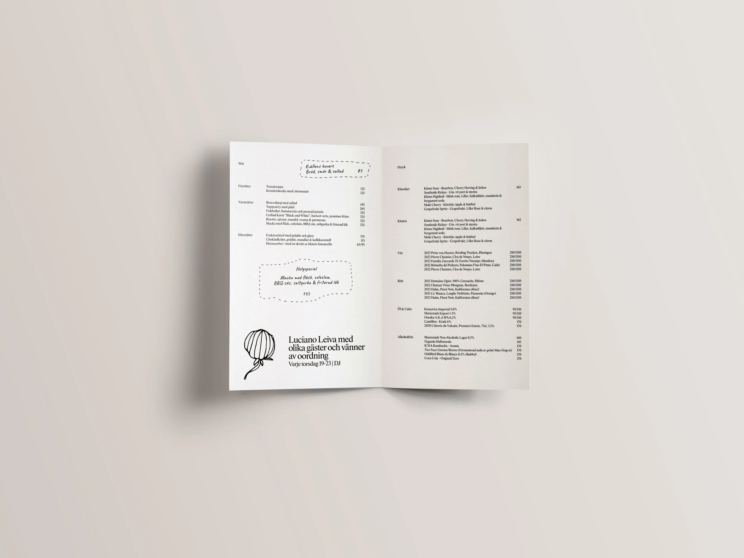 Redesigned the restaurant menus, defining layout, typography, and text hierarchy according to their brand guidelines, while incorporating existing illustrations to highlight special events such as DJ sets and art installations.