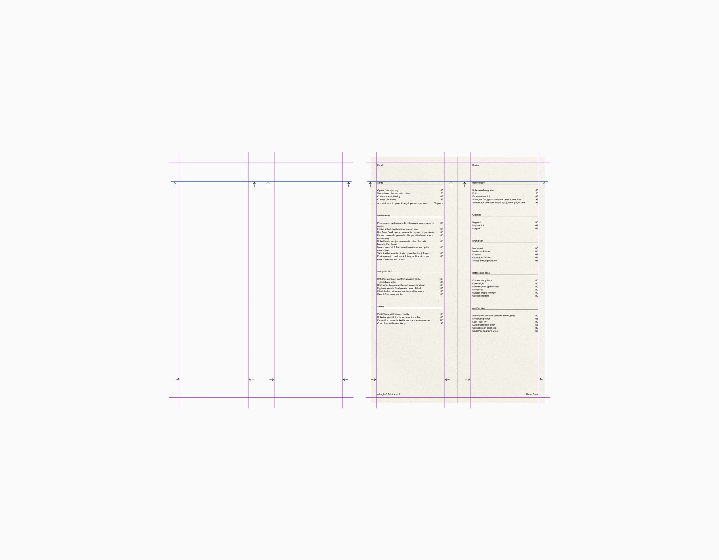 Redesigned restaurant menus, defining layout, typography, and text hierarchy according to their brand guidelines, while incorporating existing illustrations. A separate wine list was also created to complement the main menus.